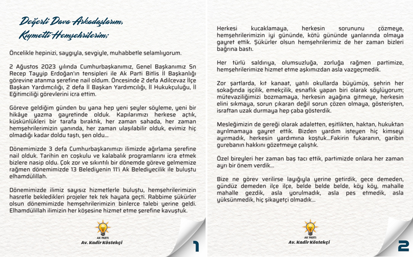 AKP Bitlis İl Başkanı Kadir Kadir Köstekçi, şu mesajları verdi: