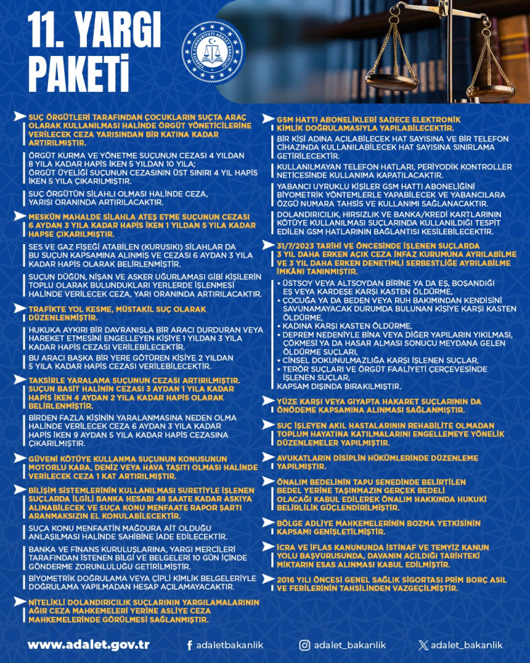 TBMM Genel Kurulu’nda kabul edilen 11. Yargı Paketi ile suçla mücadele güçlendirilecek, temel haklar korunacak ve hukuki güvenlik artırılacak.