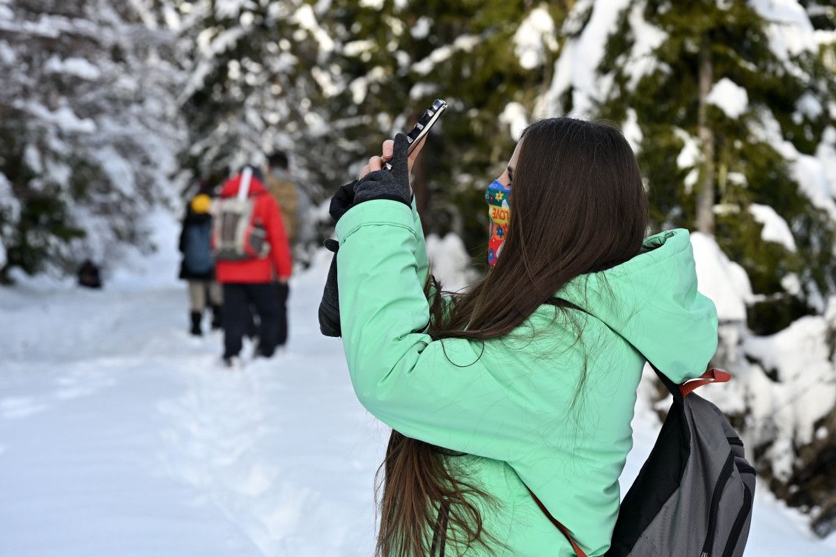 Kristalize kar taneleri eşliğinde ilerleyen ekip orman içindeki yatay geçişlerde çam ağaçlarının üzerine çöken kar yükününün oluşturduğu masalsı görüntüleri bol bol fotoğrafladı.