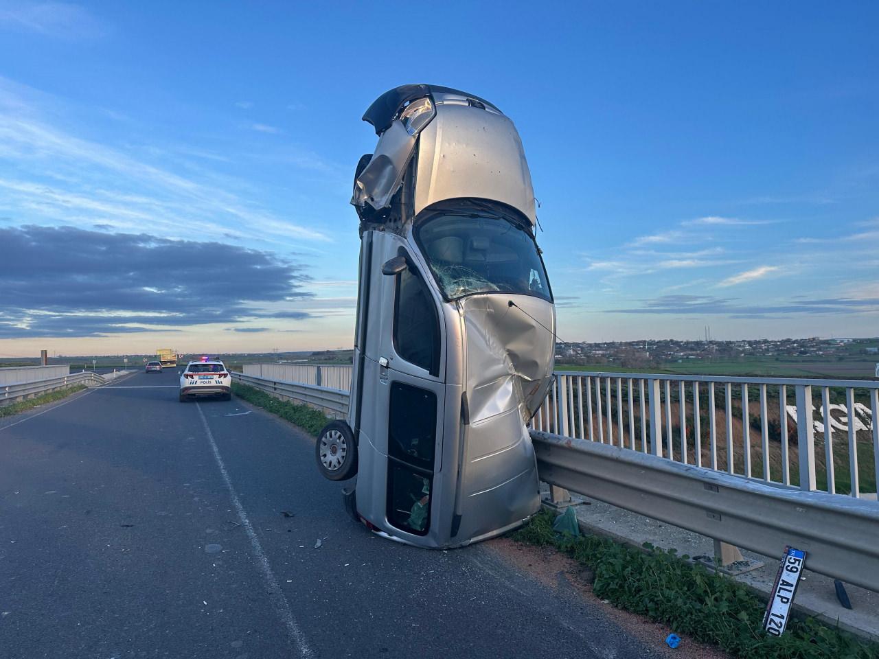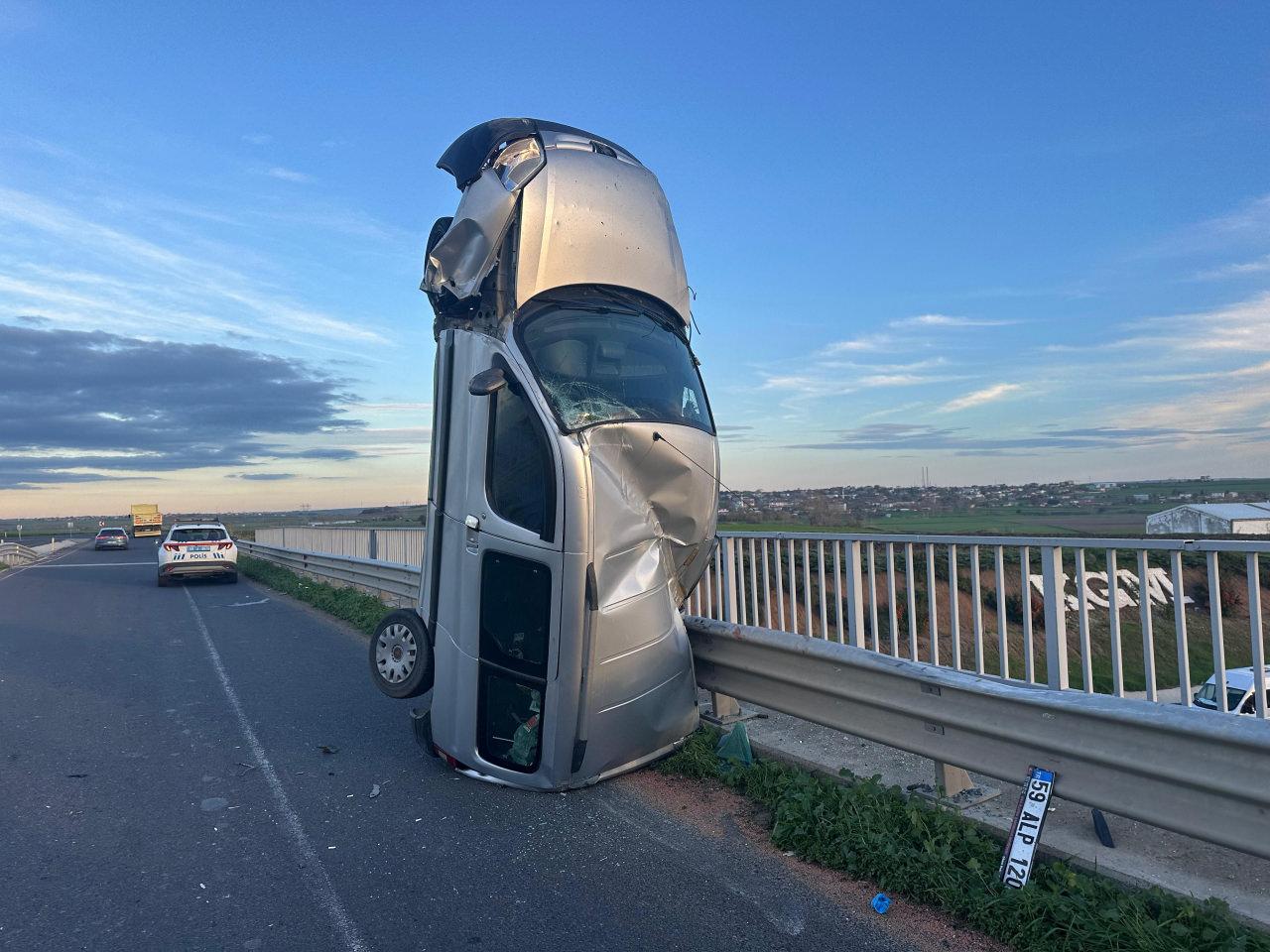 Muratlı–Büyükkarıştıran karayolu üzerinde A.Ç.’nin kullandığı 59 ALP 120 plakalı hafif ticari araç, köprü üzerinde kontrolden çıkarak bariyerlere çarptı ardından dik şekilde durdu.