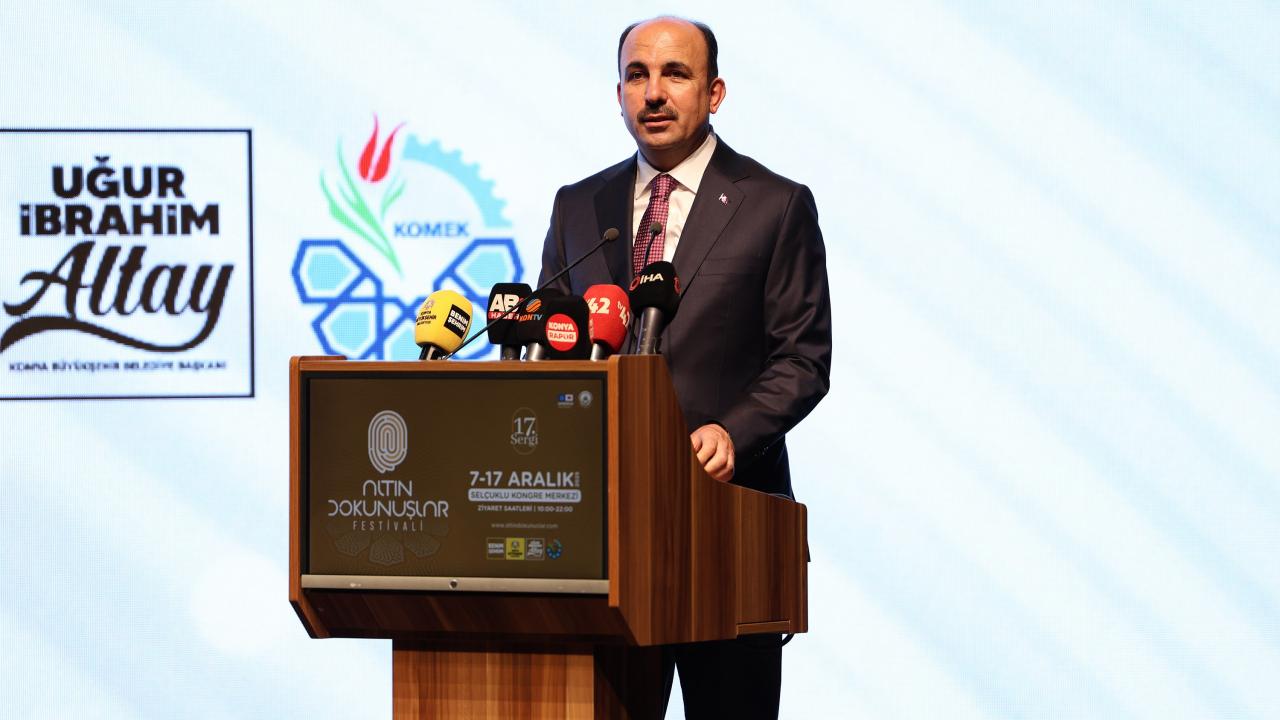 Selçuklu Kongre Merkezi’nde düzenlenen programda konuşan Konya Büyükşehir Belediye Başkanı Uğur İbrahim Altay, “Altın Dokunuşlar Festivali’nin el emeğini estetikle buluşturan; sabırla ve zarafetle yoğrulmuş eserleri bir araya getiren bir sergi olduğunu söyledi.